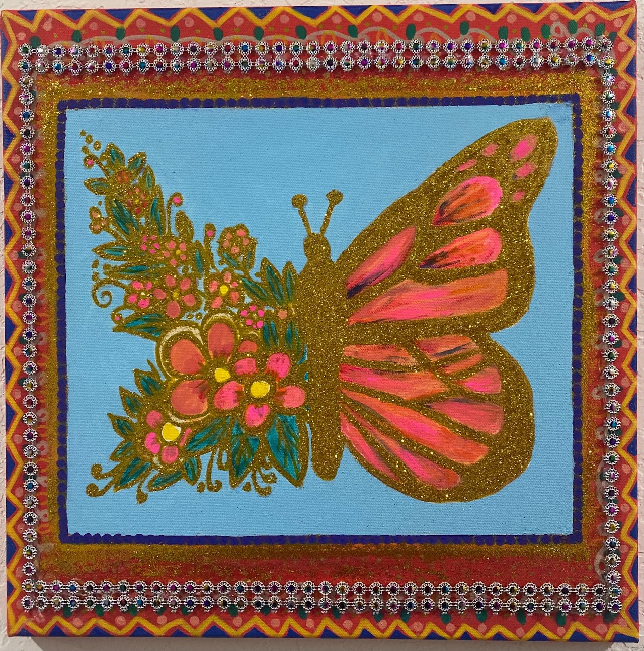 Mixed media acrylic with glitter and lace.